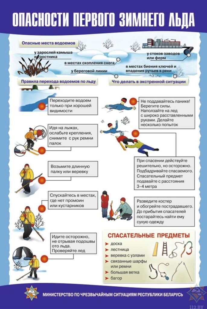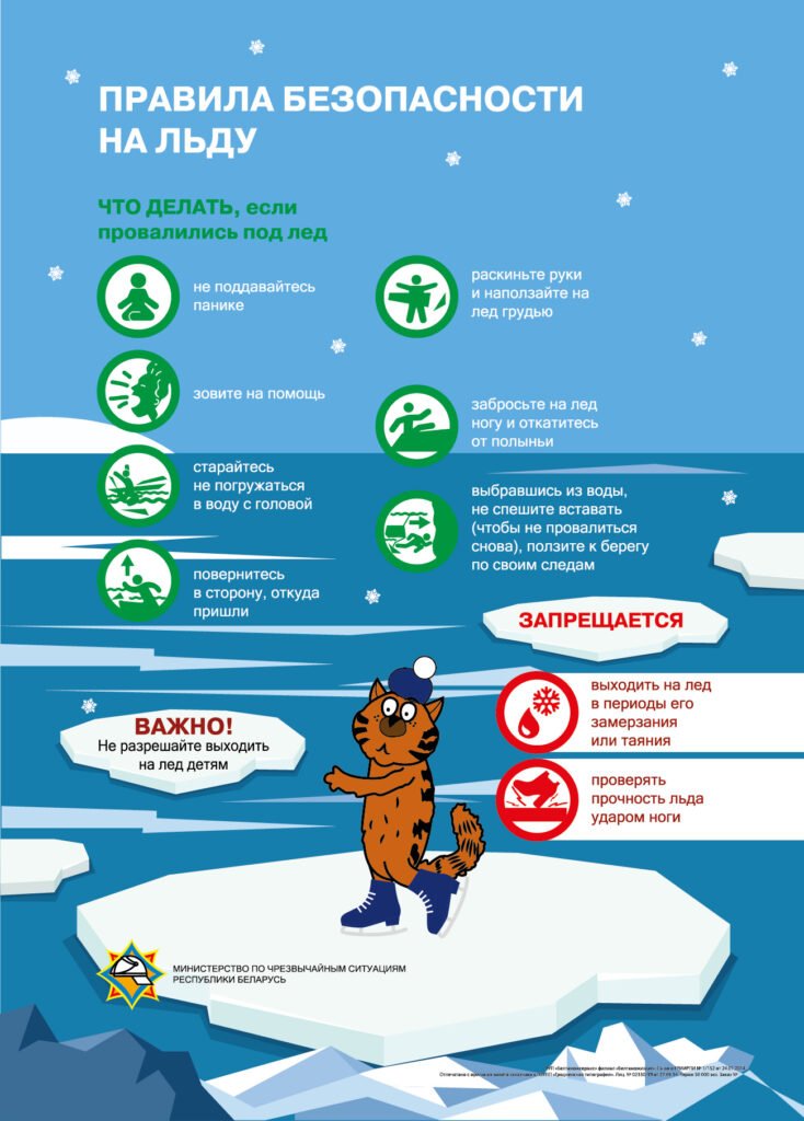 Согласно Правилам охраны жизни людей на водах, утвержденным Постановлением Совета Министров Республики Беларусь № 543 от 18 августа 2023 года, граждане при выходе на лед, в том числе для осуществления рыболовства с ледового покрытия, обязаны надеть спасательный жилет, который должен соответствовать размеру и обеспечивать положительную плавучесть в воде с учетом суммарной массы тела и одежды. – Детям можно выходить на ледовое покрытие только в сопровождении совершеннолетних. Во время осуществления рыболовства запрещается пробивать лунки на расстоянии менее 1 метра от одной лунки до другой, рекомендуется иметь с собой линь спасательный и ледовые штыри. Прорубь и иные места, где производилось извлечение ледового покрытия, диаметр которых составляет более 0,25 метра, должны быть обозначены хорошо заметными вехами.
