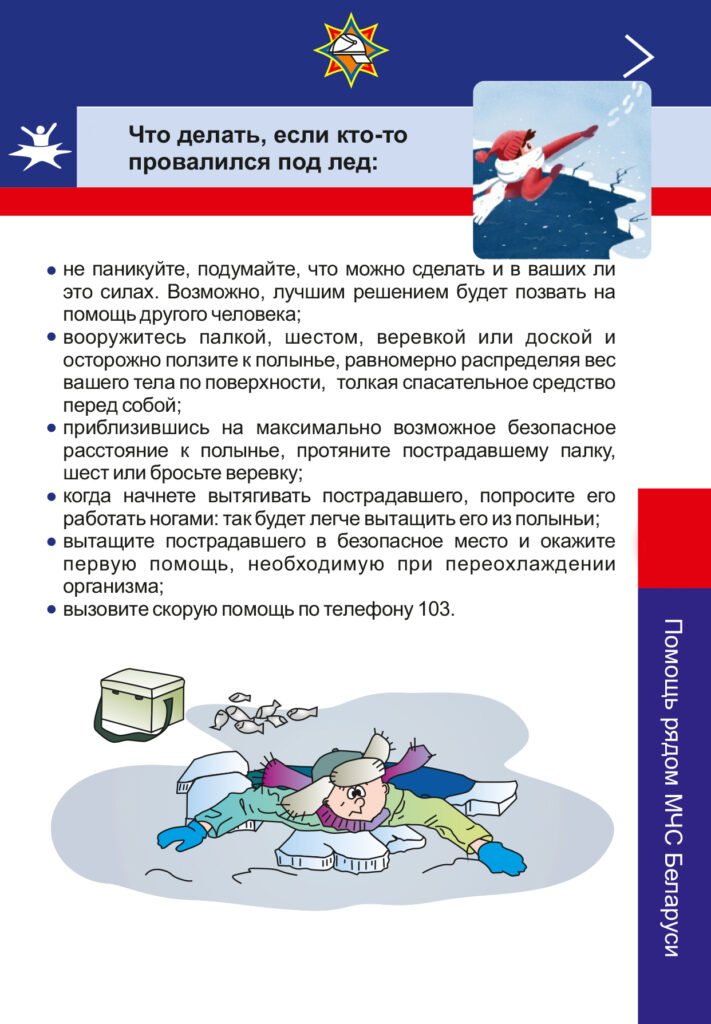 Если вы оказались очевидцем того, что человек провалился под лед, в первую очередь оцените обстановку и подумайте: сможете ли вы оказать ему помощь? Ведь при неверных действиях есть угроза самому оказаться в беде. Вооружитесь палкой либо веревкой, подползите к месту пролома льда за 3-4 метра и подайте пострадавшему второй конец имеющегося средства спасения. После извлечения человека из воды его необходимо сразу же отвести в теплое место и вызвать скорую помощь.