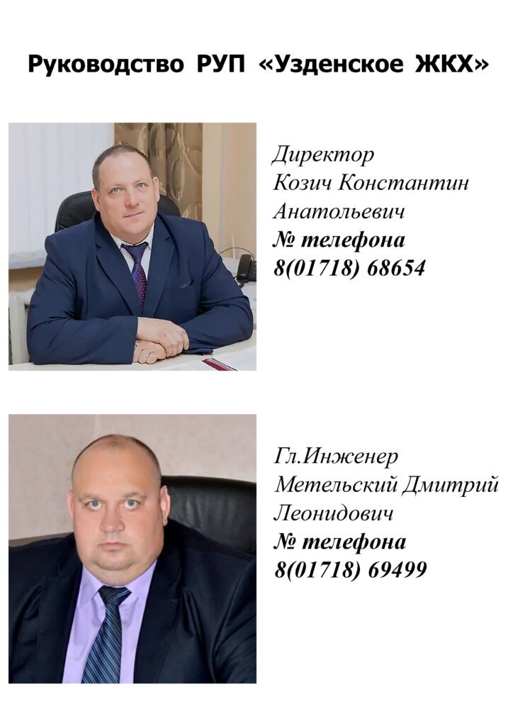 | Козич Константин Анатольевич | Директор | Работа предприятия, эксплуатация и ремонт фонда. Оказание услуг предприятием по тепловому обеспечению жилищного фонда. | 05.02.2026 17.09.2026 с 10.00 до 12.00 | 8(01718)68595 |